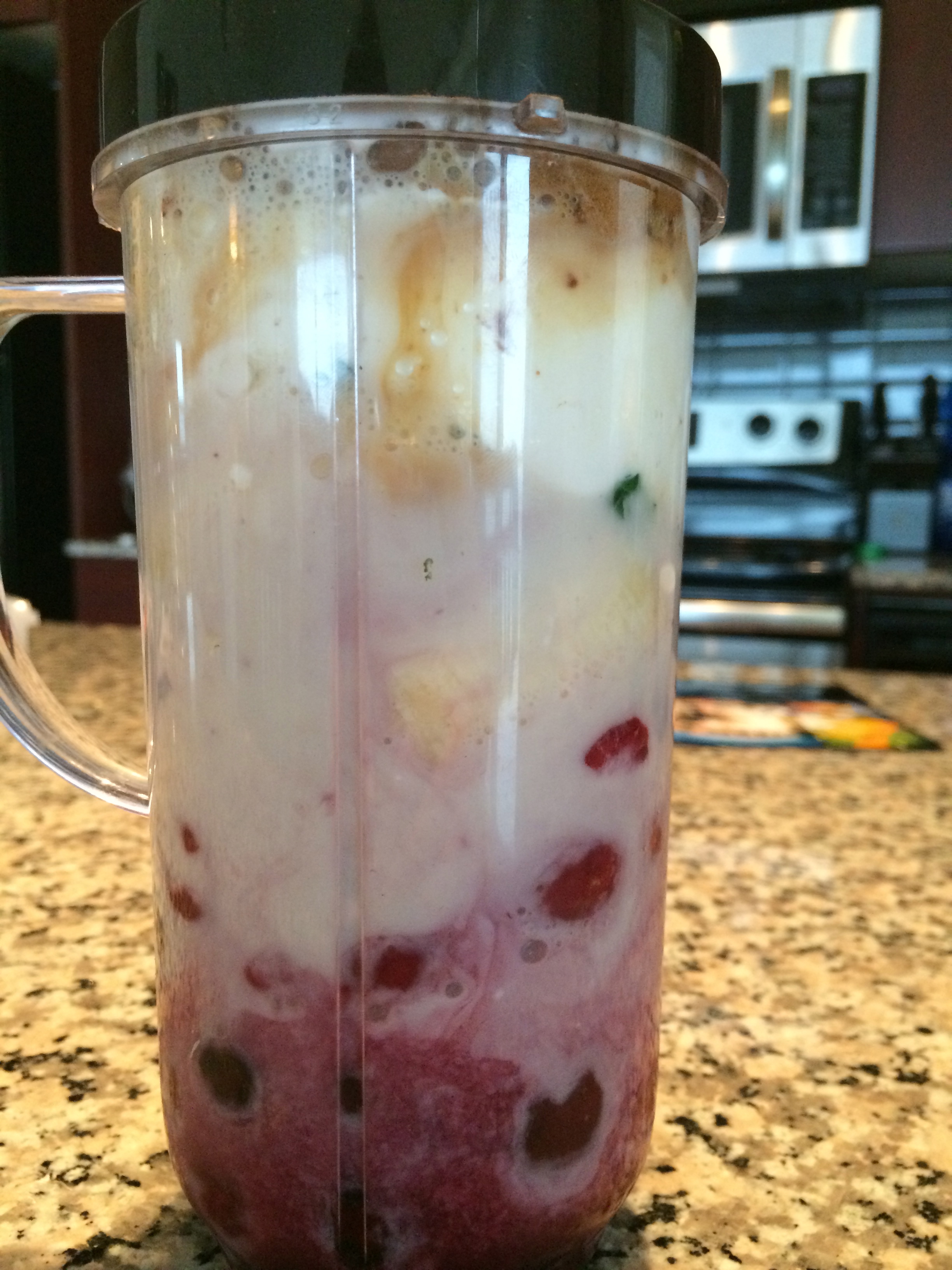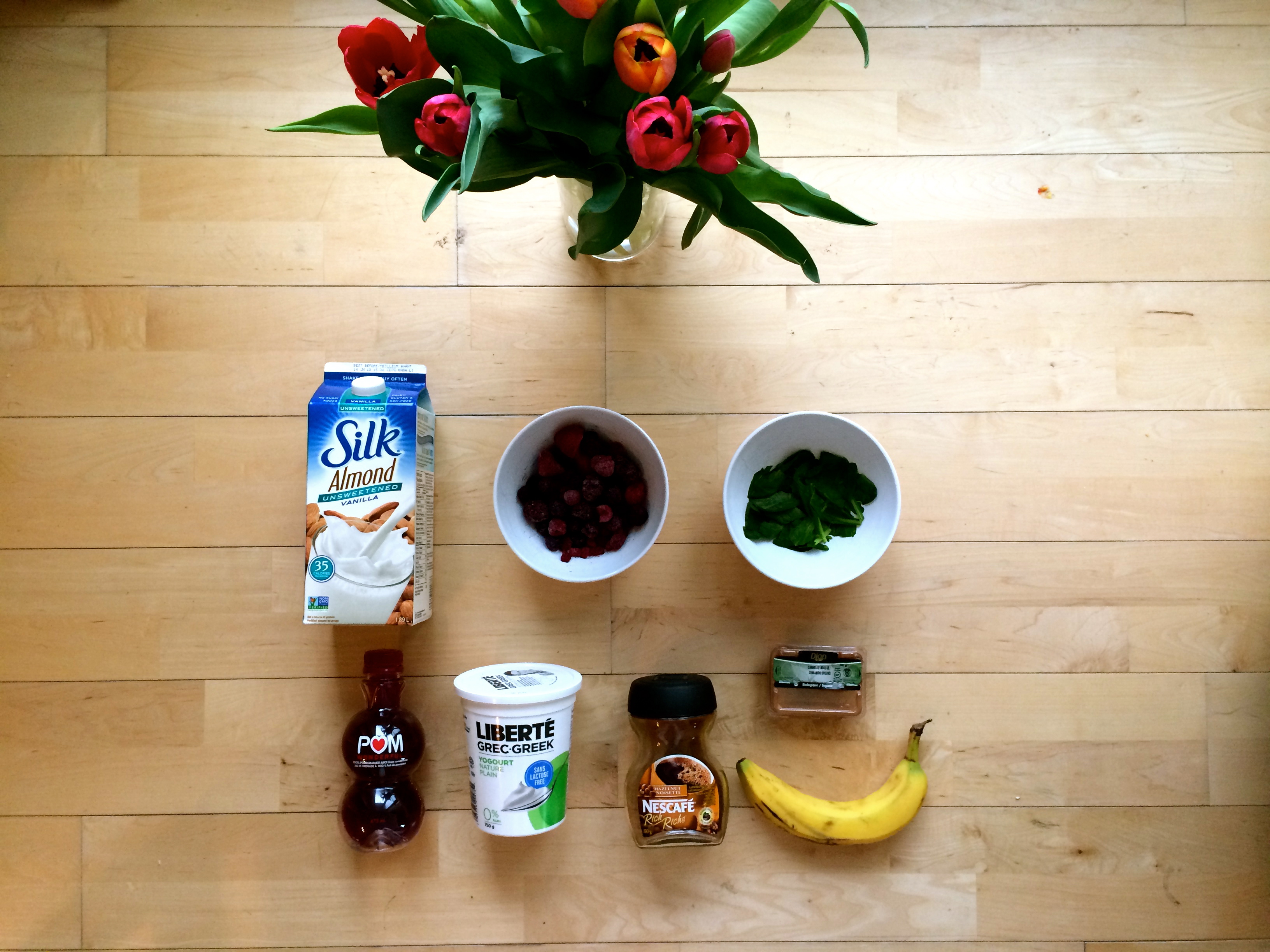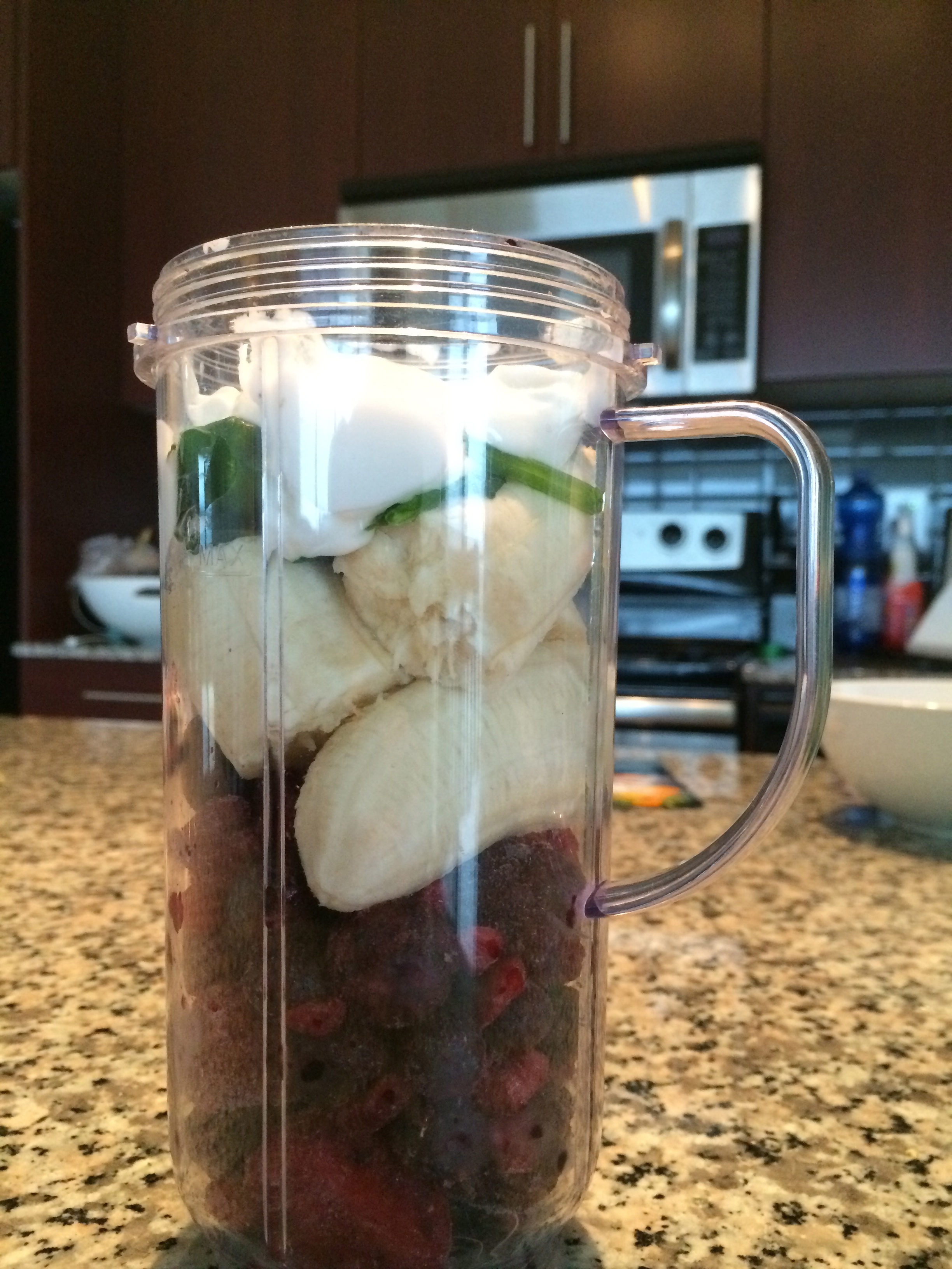 I start by adding the frozen berries, followed by the frozen spinach (Note: I freeze the spinach so it lasts longer, and doesn’t rot in my fridge). Following the berries and spinach I add in the chopped banana (Note: I don’t freeze mine as it gives the smoothie a creamier consistency), and greek yogurt. Then add a splash of pomegranate juice and fill the remainder of the cup with almond milk (Note: Add almond until the fruit is covered). Lastly, I add cinnamon for flavouring, and my secret ingredient…..instant coffee! It gives the smoothie an extra kick to start your mornings off right.
